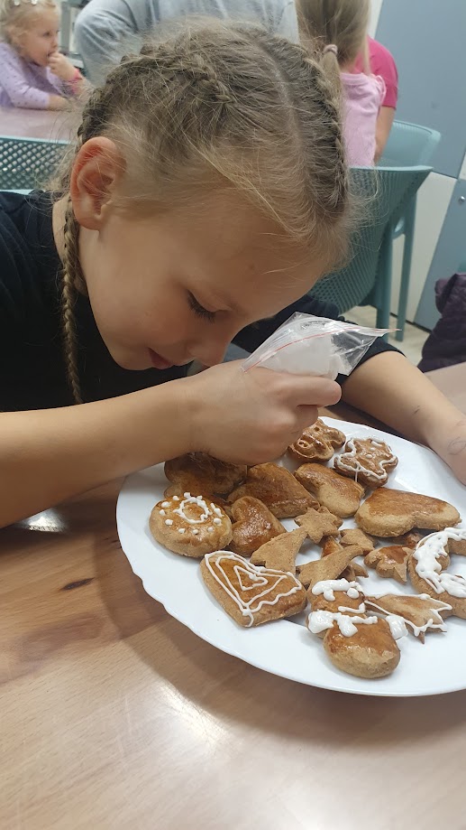 Abychom se vánočně naladili ještě víc, pustili jsme se do pečení klasických medových perníčků. Do přípravy se odhodlaně vrhli všichni, od maminek a babiček až po ty úplně nejmenší. Napekli jsme spoustu krásných srdíček, hvězdiček, stromečků, sněhuláků a mnoha dalších tvarů a ty, které jsme nestačili sníst, jsme nakonec krásně nazdobili vlastnoručně vyrobenou polevou.