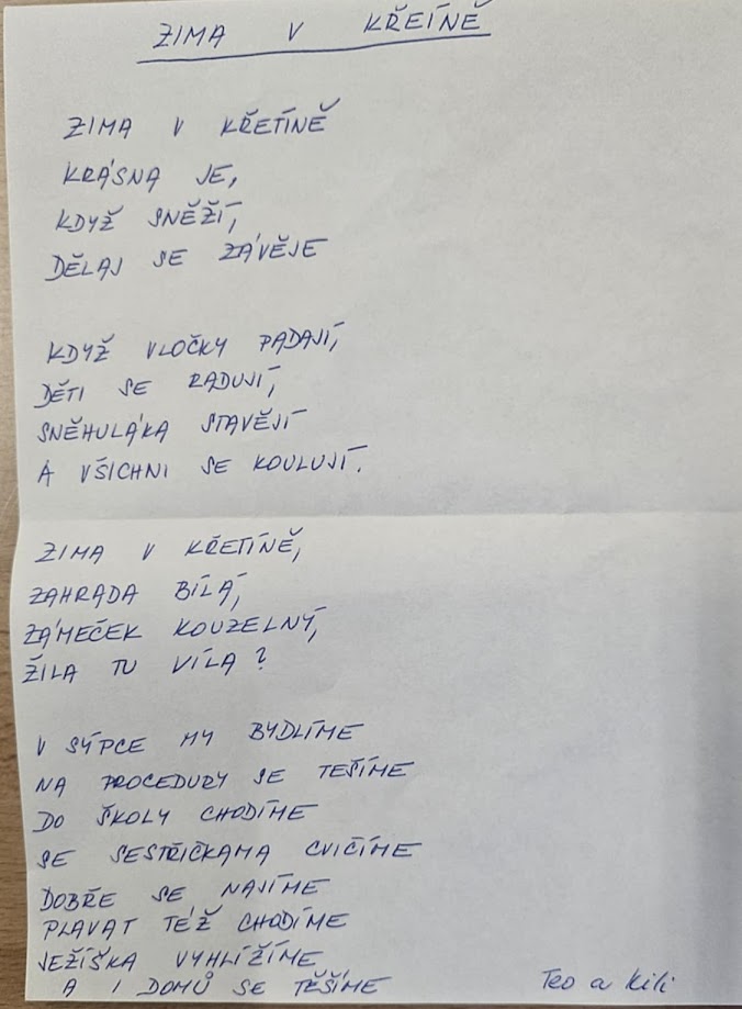 Zima nám střídavě přála déšť a bláto, ale i pořádnou sněhovou nadílku, takže jsme si v našem parku mohli užít jízdu na saních a na bobech, stavět sněhuláky nebo pravá eskymácká iglú. Dvakrát za pobyt jsme vyrazili do bazénu v Boskovicích, kde jsme kromě plavání užívali aktivní volnou zábavu, spoustu legrace na tobogánu a hry ve víru relaxačního bazénu.