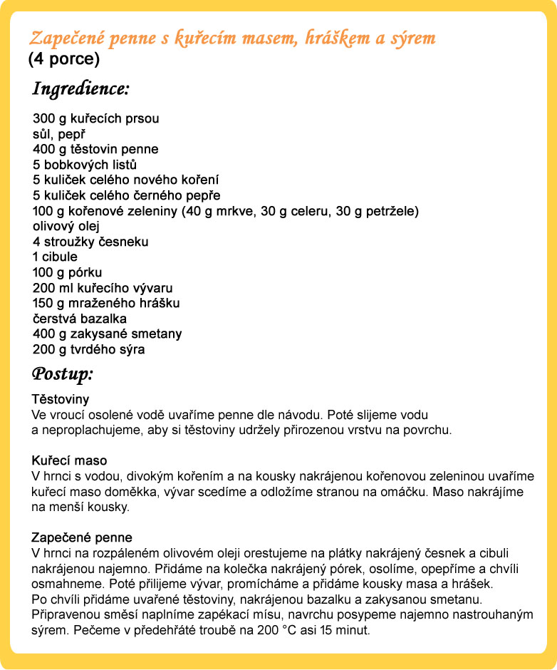 Zapečené penne s kuřecím masem, hráškem a sýrem
